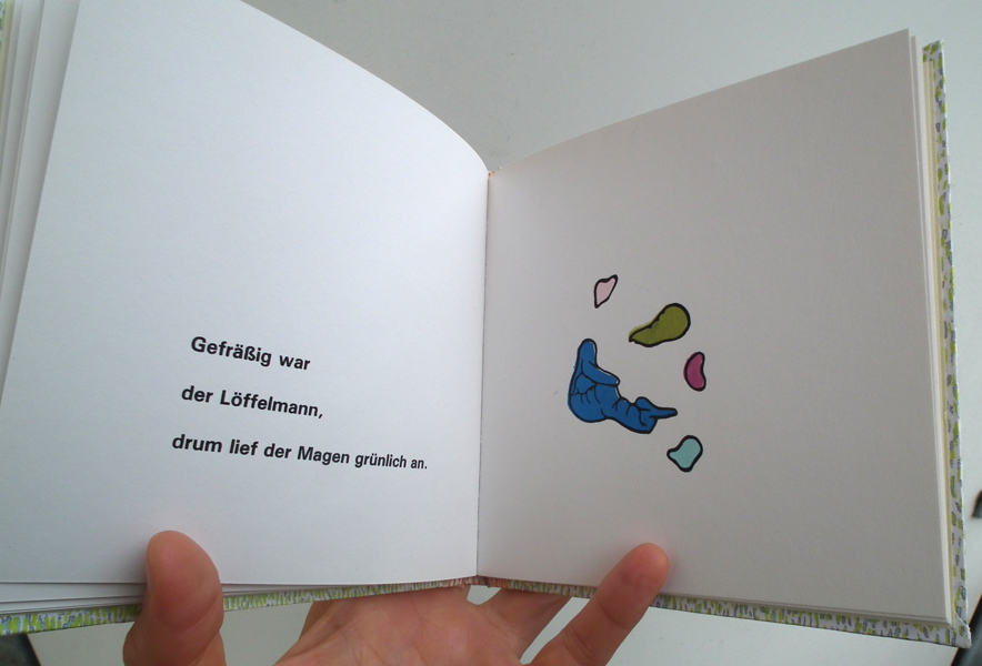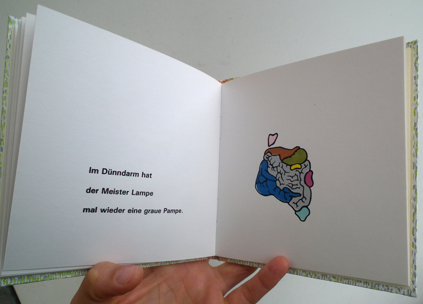 Buchprojekt. Handgebundene Siebdrucke, 17cm x 17 cm mit Hardcover. Die Gestaltung bedient sich der Ästhetik minimalistisch gehaltener Kinderbücher, wie sie von dem Niederländer Dick Bruna bekannt sind. Dessen Bücher waren seit Mitte der 1960er Jahre als didaktische Unterhaltungsliteratur für Kleinkinder weit verbreitet. Ebenso wie die Darstellungen folgen seine Texte, die zuweilen in Reimform abgefasst sind, dem Prinzip eines strengen Minimalismus.