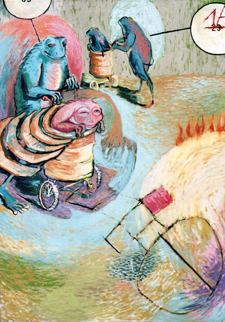 Als Vorlage für die Malereien dienten die nach einem Text Pablo Picasso entstandenen Zeichnungen Das am Schwanz gepackte Verlangen I.